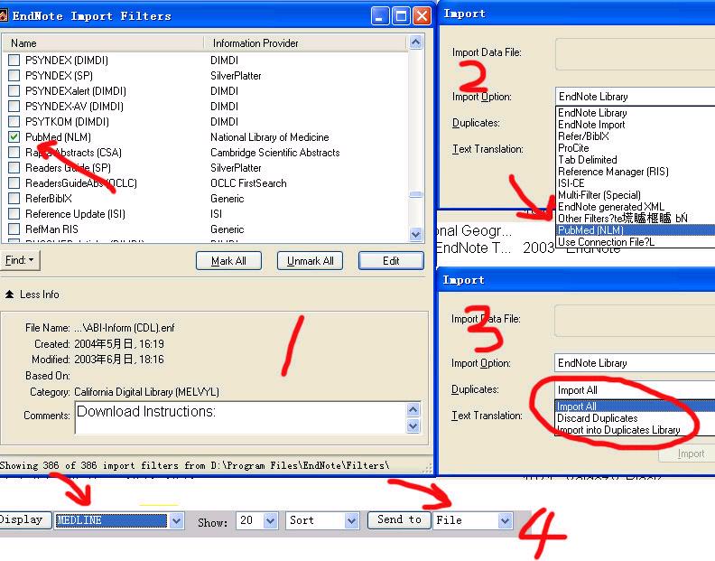 2 导入:首先打开你要导入的目标数据库,然后File-->Import,会出现导入窗口。点choose file选择我们保存的结果文件。在import option(窗口2)里面选择我们使用的数据库,这里我选择pubmed。(从这里还可以看出,endnote也可以导入reference managerprocite的数据,毕竟都是isi一家人么Smile)。在Duplicates(窗口3)里面选择import all是全部导入(与原有数据库重复的文献也导入),discard duplicates是不导入与原有文献重复的文献,import into duplicates library是把重复的文献导入到另外一个数据库中。