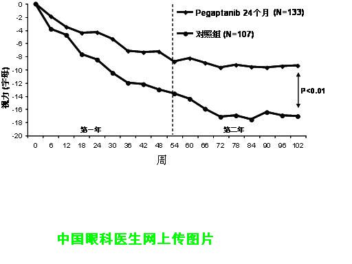 图1. Pegaptanib(0.3mg)玻璃体腔注药(每6周1次)治疗CNV的疗效两年观察。