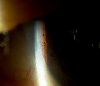 讨论:1、患者此前曾多次眼科检查。但由于患者的特殊不典型性:角膜后胚环不明显;房角入射角部分类似高原虹膜形态;虹膜与Schwalbe线粘连疏松;眼压多次测量正常范围。以上特点导致患者长期未得到确诊。应当引起重视。 2、关于先天性房角异常。 先天性房角异常源于细胞分化异常或胚胎期组织退化滞后。其最常见的良性改变为角膜后胚胎环。正常的Schwalbe线为小梁网和角膜后弹力层终点的连接处。角膜后胚胎环表现为Schwalbe线加重、突起和向中央移位,裂隙灯下显示白色、明亮的不规则弧线,距角膜缘0.5~2.0mm。但在正常眼中约3~15%亦可见这种异常。1920年,Axenfeld在报道首例Axenfeld异常时,引入了“后胚环”的概念。先天性房角异常尚可伴随虹膜发育不良或位置异常;角膜后弹力层异常;瞳孔形态异常或无瞳孔等。与Axenfeld异常关系密切的Rieger异常便是如此。在Rieger综合症的描述中,Rieger首先引入了“角膜虹膜中胚层发育不良”的概念,即前房分裂综合症(旧称)。先天性房角异常还可以成为全身性综合症的眼部表现,如Alagille综合症(肝动脉发育不良)、X-联琐鱼鳞癣病、家族性先天无虹膜、Down’s综合症等。 角膜缘后胚胎环