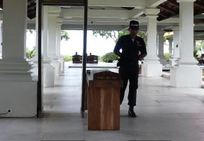 The Bali Tourism and Development Corporation (BTDC) execute the management of the Nusa Dua enclave and are responsible for the security operation of the peripheral of Nusa Dua. 76 security officers, 17 tourist police officers, and 110 police officers ensures a 24 hours, 7 days a week security of the enclave with specific attention to the 4 entry points to Nusa Dua. The beach, marine and tourist police force stands at 35 and additionally, the village of Nusa Dua situated outside the enclave, with their traditional security system manned by 55 personnel is actively involved in ensuring the security of the area through an informal network, which quickly detects, verifies and communicates movement of people not known to the local community. All cars are checked with metal detectors including the interior and booth, and patrol system has been installed since June, 2007 allowing monitoring the time each of the areas has been inspected.