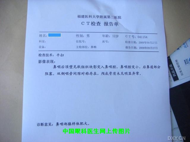 gaoyingying wrote: 该患者符合眼睑松弛综合征的诊断(floppy eyelid syndrome,FES),眼睑松弛度2级,但是FES好发于中年男性,肥胖患者,俯卧睡觉的主要原因是因为肥胖导致仰卧时胸廓受压,呼吸不畅,而且常有夜间打鼾。这些情况与该患者不相符合,患者体型偏瘦,无夜间打鼾。考虑有可能是呼吸不畅导致习惯性的俯卧睡觉,予行鼻咽部CT,结果见图,患者遂转至五官科治疗,2日后行腺样体摘除术。现为术后3周,患者已经改变了睡眠姿势,术后未出现右眼红和视朦的情况。将继续追踪。 另:患者就诊时右眼角膜上皮点状着色,但是没有眼红,畏光,流泪等不适,如何解释?