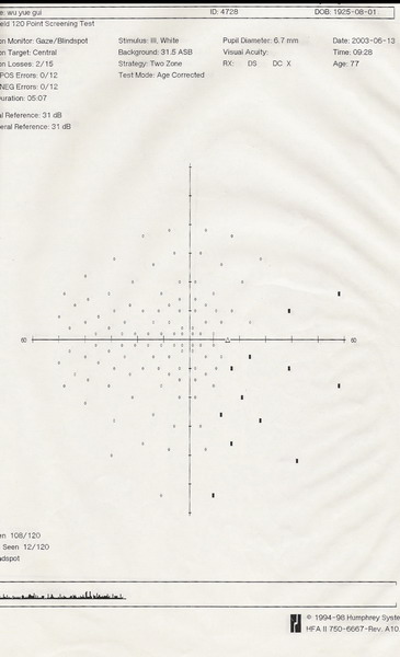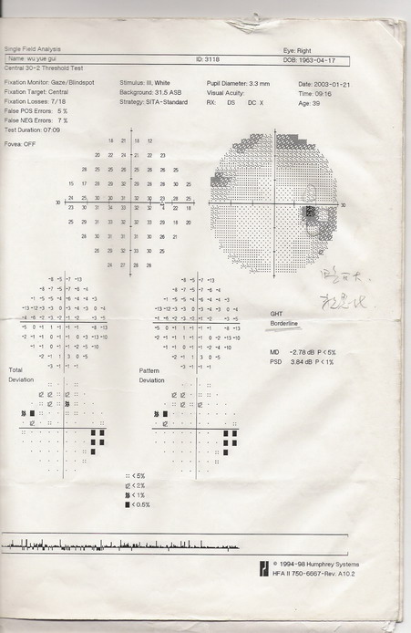 2003年11月12日B超:右眼玻璃体轻度混浊,右眼视网膜脱离