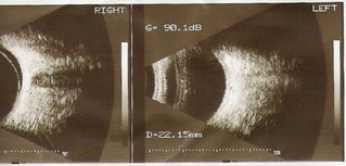 2005年4月8日B超:右眼玻璃体轻度混浊,右眼视网膜脱离,视盘凹陷(青光眼型)