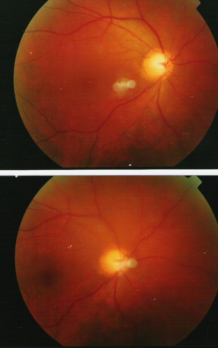 2003年11月诊断为右眼葡萄膜炎,视网膜脱离,继发青光眼,住院接受治疗。甲强龙80mg日一次静点7天,60mg静点5天,40mg静点3天,甲强龙40mg半球后隔日一次注射,并局部应用降眼压药。出院后继续甲强龙20mg静点3天,后改为30mg日一次口服,对症降眼压治疗。
