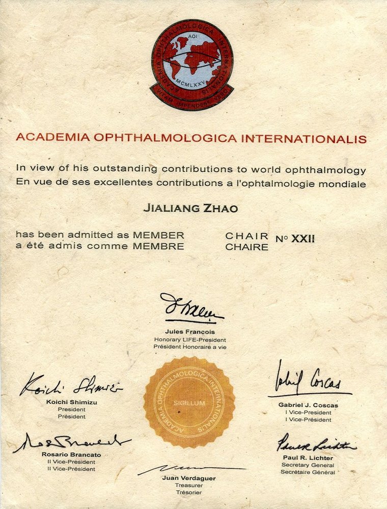 国际眼科科学院共有60个席位,由对国际眼科事业做出突出贡献的眼科学家组成。当选该院院士须经老院士提名并经提名委员会筛选,最后由全体院士大会选举产生。赵家良教授为我国第一位进入国际眼科科学院的院士,这也是我国眼科界的殊荣。