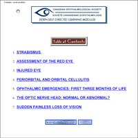 加拿大眼科学会出版的供自学用的几个课程 1、斜视 2、红眼的处理 3、眼外伤 4、眼眶及眶周蜂窝组织炎 5、新生儿头三个月的眼科急诊 6、视神经乳头:正常还是异常 7、突然的无痛性视力下降