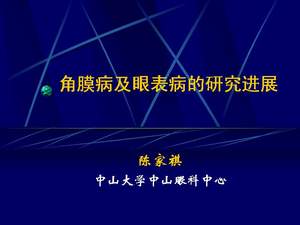 一、感染性角膜炎致病微生物的变迁 • 感染性角膜病仍是我国最主要的角膜盲原因 • 不同地区常见致病菌不同 • 不同时期,致病菌的构成比也有变迁 一、感染性角膜炎致病微生物的变迁 (1)细菌性角膜炎: l 革兰阳性球菌占51.0% l 革兰阴性杆菌占39.4% l 革兰阳性球菌近十年来呈上升趋势 l 1997年70.8% l 条件致病菌明显增加(表皮葡萄球菌) 张文华等.中华眼科杂志,2002,38:8-12 北京同仁眼科中心,1995-2000年间,1430例 孙旭光等. 中华眼科杂志,2002,38:292-294 北京同仁眼科中心,1989-1998年间,2220例 (2)真菌性角膜炎 l 华北、华中、华南 l 首位:镰孢菌属 l 华北及华中地区 l 主要致病菌基本相同 l 依次为镰孢菌属、曲霉菌及青霉属 l 华南地区 l 1975~1986,曲霉菌、镰孢菌属及青霉属 l 1989~1997,镰孢菌属、曲霉菌及弯孢霉属 王丽娅等. 中华眼科杂志,2000,36:138-140 完整演讲稿点击下载链接