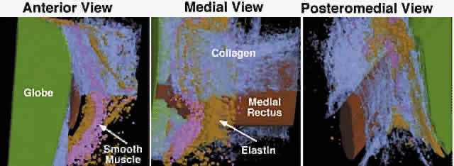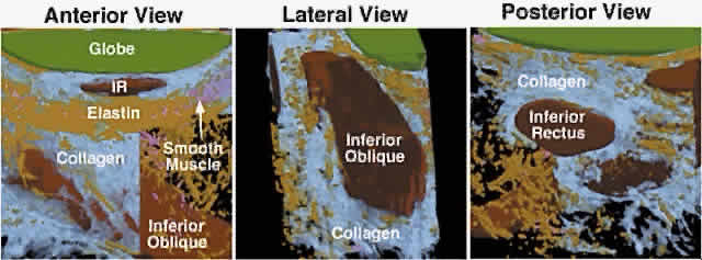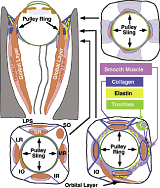 action.11 The discrete points in the anterior orbit where the EOM paths are inflected constitute the functional, mechanical pulleys, whose structure will be described in detail below. Anterior to the pulleys, rectus EOM paths shift, sharply when necessary, to follow the scleral insertions in eccentric positions of gaze. The pulleys thus act as functional mechanical insertions of the rectus EOMs. The pulling direction of each EOM is thus defined by the line segment connecting the EOM's scleral insertion to the respective pulley, so that the location of the pulley influences EOM action profoundly. Pulleys consist of discrete rings of dense collagen encircling the EOM and are about 2 mm in length, coaxial with less substantial collagenous sleeves around the EOM (Fig. 9; see Fig. 2). Anteriorly, these sleeves thin to form slings convex to the orbital wall, and more posteriorly the sleeves thin to form slings convex toward the center of the orbit. The anterior pulley slings are also known as the intermuscular septa. The collagenous pulley ring forms the fulcrum of the pulley that inflects the EOM path. Not surprisingly, given this pivotal mechanical role, electron microscopy demonstrates the fibrils of pulley collagen to have an unusual criss-crossed configuration suited to high internal rigidity.12 Elastic fibers in and around pulleys provide reversible extensibility essential to these resilient tissues.13–15 Reversible extensibility, particularly in connective tissue bands that connect the pulleys to bony anchors on the orbital rim, means that the pulleys are suspended under elastic tension that tends to draw them anteriorly. Bands of SM in the pulley suspensions (see Fig. 9), and particularly the peribulbar muscle connecting the nasal aspects of the vertical rectus pulleys, provide a means of active generation of modulatory force on the pulleys.14 The overall structural organization of the pulleys is illustrated in Figure 10. The anterior pulley slings, forming what has also been termed the intermuscular membrane, are routinely dissected at strabismus surgery. Note that the orbital layers of each rectus EOM insert on their respective pulleys and act to oppose the passive tension produced by the elastic suspensions of the pulleys from the anterior orbit. The pulley suspensions have also been described as check ligaments, a term that fails to describe their mechanical functions clearly. The region of the pulleys and their sleeves is endowed with dense connective tissue that constrains EOM paths. Posterior Tenon's fascia forms a socket for the globe, suspended from the orbital rim like a drumhead. The peripheral part of posterior Tenon's fascia is very dense with collagen, elastin, and SM in circumferential distributions. The pulley sleeves penetrate this part of posterior Tenon's fascia. The central part of posterior Tenon's fascia is thin and compliant, so that the optic nerve, the ciliary nerves, and the ciliary vessels can pass through it easily despite large gaze shifts. Note that posterior to the pulleys, there is no connective tissue to constrain EOM paths. There is no “muscle cone,” only loose, areolar lobules of fat among the EOMs, vessels, and nerves of the posterior orbit. Surgical dissection of the pulley rings or of posterior Tenon's fascia should be avoided, for in addition to liberating deep orbital fat, this will damage the essential function of the pulleys and promote adherence to the globe and scarring of these dense connective tissues that can severely limit normal eye movements. Detailed views of the 3D structure of the rectus pulleys can be obtained by computer-assisted reconstruction of serial, coronal histologic sections stained for specific tissue constituents such as collagen, elastin, and an alpha-actin specific to SM. Such reconstructions, when manipulated using computerized virtual reality techniques, enable orbital tissues to be visualized from perspectives not otherwise possible. Figure 9 shows a posteromedial view of the MR pulley, as if seen from the surgically inaccessible center of the orbit, demonstrating its sleevelike character. Figure 9 also provides a surgically possible anterior view of the MR pulley region, in which the collagen in the inferior half of the pulley has been rendered transparent to display the embedded elastin and the extensive peribulbar SM. The anatomic relations above can, with the benefit of the preceding insights, be readily demonstrated in gross dissections and in surgical exposures. After a typical conjunctival incision and engagement of a rectus muscle on a surgical hook, the white anterior pulley slings come immediately into view. These tissues play little role in constraining EOM paths, although they are related to the more posterior pulley rings. The anterior pulley slings can, with the occasional exception of the lateral levator aponeurosis at the superior border of the LR, be posteriorly displaced by blunt dissection, although sharp dissection is sometimes unavoidable despite its undesirability. After this posterior displacement, fine fibrous bands constituting the insertion of the orbital layer of the EOM on the glistening white pulley suspension can be visualized (Fig. 11A). This insertion site is intimately related to the mechanically effective site of the pulley, the connective tissue ring, as better demonstrated in cadaveric preparations such as Figure 11B. In such preparations, the anterior anchoring point of the MR pulley may be confirmed to be at the anterior lacrimal crest. With detachment of the orbital layer from the MR pulley, the pulley ring may be stretched under high tension to demonstrate the complete ring in posterior Tenon's fascia (see Fig. 11B). Unless the insertion of the orbital layer on the pulley is severed (generally an unnecessary surgical maneuver), the MR cannot through surgical accident slip posteriorly through the pulley to become “lost” in the deep orbit. All the other rectus EOMs are 