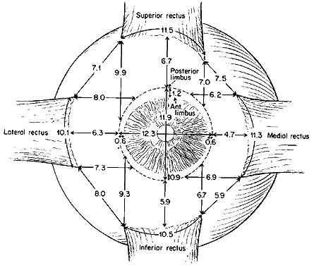 to the corneal limbus varies systematically among the rectus EOMs (Fig. 19); it is shortest for the MR and progressively greater for the IR, LR, and