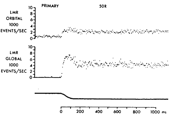 muscle. In contrast to the sluggish behavior of MIFs, SIFs are probably the fastest and most metabolically active muscle fibers in the body.4 The critical fusion frequencies of SIFs are high, with many exceeding 150 Hz.32 Isometric twitch contractions of EOMs are about twice as fast as in skeletal muscles, consistent with the requirements of ocular saccades, the fastest movements made by any part of the body. Orbital singly innervated, and red global singly innervated, fibers have the highest fatigue resistance and oxidative capacity of all EOM fiber types. Blood flow in EOMs is higher than in any skeletal muscles. These observations emphasize that EOMs are fundamentally different from skeletal muscles.4 Differences in EOM fiber types are consistent with different functional roles. As illustrated by the electromyographic (EMG) data in Figure 20, orbital layer fibers have lower recruitment thresholds than global layer fibers.33–35 Many global layer fibers are quiescent just out of their fields of action, whereas orbital layer fibers are generally active throughout the oculomotor range and have higher EMG activity throughout. This behavior is required by the mechanical properties of the orbital tissues. The mechanical load on the orbital layer consists mainly of the elasticity of the attached pulley suspension. Collins has pointed out that the main load on an EOM attached to the globe is viscosity arising from the relaxing antagonist EOM.34 Thus, during saccades, orbital layer fibers develop an initial phasic pulse of activity to move the globe briskly despite the viscosity of the relaxing antagonist, followed by a tonic step of activity to maintain the new globe position against the lesser static elastic load (Fig. 21). A phasic pulse of force in the orbital layer is unnecessary to achieve brisk pulley motion against the mainly elastic load of the connective tissue suspensions of the pulleys, accounting for the finding of only step changes of EMG activity during saccades in the orbital layer. However, elastic loading by passive connective tissue requires that orbital layer fibers maintain active tension throughout the oculomotor range to avoid slack (zero tension) out of the field of EOM action. In contrast, global layer fibers remain under tension even when not actively innervated, because the antagonist EOM stretches them. This latter property allows global layer fibers to exhibit initial electromyographic activity farther into their field of action than global layer fibers, and the greater resting activity in the orbital layer accounts for its greater blood flow and oxidative capabilities. |