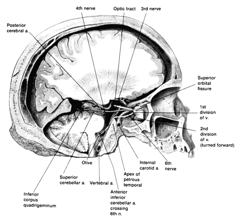 The organizational scheme of the oculomotor nucleus was proposed by Warwick.1 This hypothesis was substantiated by using retrograde degeneration techniques in monkeys. Substantiation of Warwick's hypothesis in humans relies on autopsy findings and neuroimaging results.2–4 Recent research in monkeys has suggested that the medial rectus muscle may not have only one subnucleus, as suggested by Warwick, but may receive innervation from three separate regions within the oculomotor nerve complex, which have been labeled A, B, and C.5 In addition to the extraocular muscle motor fibers, the Edinger-Westphal nuclei supply the parasympathetic preganglionic neurons that project to the ciliary ganglion. These nuclei are positioned dorsal and medial to the muscle motor nuclei. They are composed of two cell groups, a medial unpaired column and a lateral paired column. All evidence suggests that these fibers project ipsilaterally. There is a second source of parasympathetic fibers projecting to the ciliary ganglion in monkeys. Burde and Loewy6 have shown the source of these fibers to be Perlia's nucleus. This nucleus is found in the middle third of the oculomotor complex, positioned dorsally. The role of this structure in humans is unknown. FASCICLE The fascicular portion of the oculomotor nerve descends as its moves ventrally and laterally through the mesencephalon (Fig. 3A). The fascicles pass through the medial longitudinal fasciculus, the red nucleus, and the medial portion of the cerebral peduncle. During the passage through the ventral midbrain, there appears to be topographic organization of the fascicles so that a divisional paresis is possible even with intrinsic lesions.4 The oculomotor nerve exits the brain stem into the interpeduncular fossa as a horizontal arrangement of multiple fiber bundles that rapidly coalesce to form the subarachnoid portion of the third cranial nerve. NERVE After exiting the brain stem, the oculomotor nerve continues to course downward and laterally, reaching the top of the clivus at a point just lateral to the posterior clinoid process. During the passage through the subarachnoid space, the nerve passes just below the posterior cerebral artery and above the superior cerebellar artery (Fig. 4). After passing between these two arteries, the nerve travels adjacent to the posterior communicating artery. The close apposition of third nerve to these vascular structures accounts for the frequent involvement of this nerve by vascular anomalies, such as an aneurysm of the posterior communicating artery.