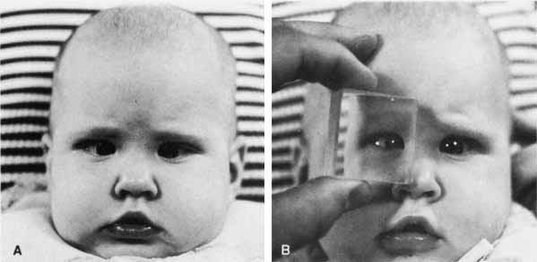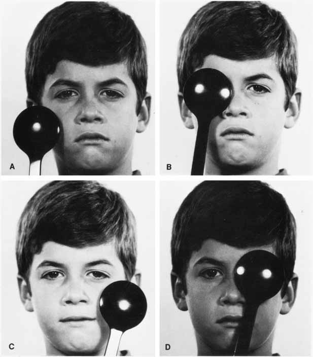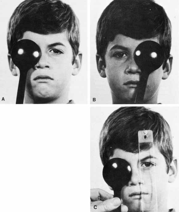 Determination The methods used to determine the eye alignment in the primary position are varied and multiple. No single test invariably assesses the alignment accurately in all patients. There are four basic types of alignment tests: the various cover tests, which depend on the fixation reflex; the corneal reflex tests, which are based on the ability of the curved corneal surface to reflect an examining light; the dissimilar image tests, which are based on the patient's response to diplopia produced by converting an isolated object of regard into different images on each retina; and the dissimilar target tests, which are based on the patient's response to the dissimilar images created by each eye viewing a different target. COVER TESTS Because the cover tests are based on the fixation ability of the eye, fixation ability must first be assessed. Patients without fixation ability in each eye (eccentric fixation) are unable to have eye alignment checked by cover tests. Also, the patient's accommodation must be controlled with an appropriate target. An accommodative target is a small target designed to control the patient's accommodation if the patient's response supplies clear vision; this target is required during the cover test. Advantages of cover testing include a high degree of interobserver repeatability, easy quantification using prisms, and the ability to accurately measure the angle of deviation in all fields of gaze. Cover–Uncover. The patient's right eye is covered while fixating a series of distant accommodative targets. After 2 to 3seconds, the right eye is uncovered and the left eye covered. When covering one eye, the examiner's attention is directed to the opposite, uncovered eye, looking for movement of this eye. An absence of movement of an eye when the other eye is covered (Fig. 1), occurring in both eyes, means that the patient does not have a heterotropia, but it does not differentiate between orthophoria and heterophoria. The alternate cover test is required to make this differentiation. Alternate Cover. The basic principle of this test is to prevent fusion for the duration of the test. This is accomplished by constantly maintaining a cover over one or the other eye, shifting it swiftly from eye to eye while the examiner looks for movement of the uncovered eye as it assumes fixation (Fig. 2). The rapid shift applies only to the speed of movement of the cover and not to the duration it is held before the eye; in fact, the exam-iner should maintain the cover over each eye for 2 or 3 seconds before rapidly shifting it. No movement of either eye indicates orthophoria. The patient whose eye moves on alternate cover has either a heterophoria or heterotropia. Differentiation between the two requires the cover–uncover test because there is not movement for either cover–uncover or alternate cover testing in orthophoria. The direction of the shift identifies the type of heterophoria or heterotropia. A temporal horizontal shift is esophoria or esotropia, a nasal shift is exophoria or exotropia, and right or left hyperphoria or hypertropia is the movement of the right or the left eye downward. If both eyes make movements downward, it is called dissociated vertical deviation or hypertropia (see Index). Having identified a heterodeviation, the next step is to measure the quantity of misalignment by neutralizing the shift with prism power. The prism is held in the examiner's left hand in front of the patient's right eye. The examiner's right hand handles the alternate cover. The prism or prism powers are adjusted until the motion of the eyes on alternate cover is eliminated (Fig. 2C). Base-out prisms are used to compensate for an esodeviation, base-in for an exodeviation, base-down before the right eye for a right hyperdeviation, and base-up for a left hyperdeviation. Horizontal and vertical prism powers can be combined if loose prisms are used. A prism bar is handy, but it does not lend itself to neutralizing combined horizontal and vertical deviations nor is it sufficient to compensate for horizontal deviations greater than 45Δ or vertical deviations greater than 25Δ. The loose prisms must be combined for larger deviations. Vertical deviations seldom exceed 25Δ, but horizontal tropias greater than 40Δ are very common. The most convenient way for the examiner to hold combined horizontal prisms is not to superimpose them before one eye but instead to grasp the horizontal prisms either apex-to-apex (esotropia) or base-to-base (exotropia) between the thumb and index finger of the left hand, allowing the finger and thumb to cup around the patient's right eye, with one prism being positioned before each eye. The area of contact between the apexes or bases then is in the midline in front of the patient's nose. Prisms cannot neutralize cyclodeviations. Prism measurement of the strabismic angle is the most accurate technique for measurement. However, prism measurements are subject to error. Thompson and Guyton1 describe several potential sources of error. The angle at which the prism is held in front of the patient can influence the quantification of a deviation, especially with large angles. Two commonly used positions are the Prentice, in which the prism is held perpendicular to the line of sight of the nonfixating eye, and the frontal plane position, in which the prism is held parallel to the plane of the patient's face. In addition, the position of minimum deviation is reached when the angle of light incident to a prism is the same as that exiting. Glass prisms, although less common in clinical practice, are calibrated for the Prentice position, as are some prism bars2, whereas plastic prisms are calibrated for the angle of minimum deviation. It can be difficult to measure the angle of incident and exiting light from a prism, but in practice, the frontal plane position differs little from the angle of minimum deviation. However, holding a prism calibrated for the Prentice posi