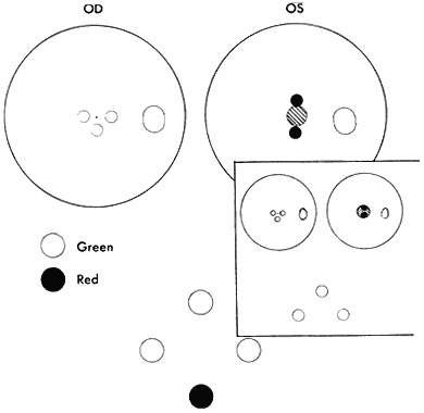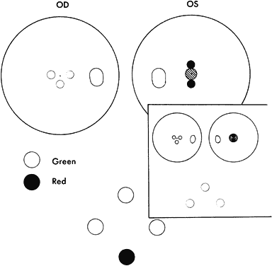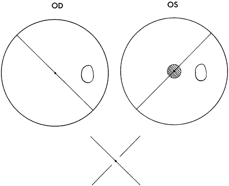 Patients with either straight eyes or with a deviation up to 8Δ by simultaneous prism and cover test and NRC binocular vision describe seeing one fixation light and two streaks forming an X intersecting at the light. The bifixating patient with macular fusion sees it as just described. If macular fusion is lacking although extramacular fusion is present, a gap of 3° is reported in one streak on either side of the light (Fig. 6). The gap represents the macular scotoma in the nonfixating eye of the monofixating patient. Monofixating patients are unaware of this gap in the one streak around the fixating light until the examiner questions them about it; they invariably seem to be oblivious to the presence of the scotoma until it is brought to their attention. When the fixating eye is covered, the gap in the streak disappears, and the entire streak then passes through the center of the fixation light. If the patient can switch fixation, the macular scotoma is observed to transfer from eye to eye.