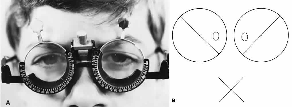| Before treatment of the sensory status in a strabismic patient, it must be diagnosed. Diagnosis of the binocular vision adaptations in strabismus is accomplished by observing the results of various tests presented to the patient. |