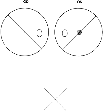The patient with exotropia of 10Δ or more may report NRC with heteronymous diplopia, ARC with suppression, or an absence of binocular vision. The large profound scotoma of the temporal retina, extending up to the hemiretinal line in the exotropic patient with ARC, prevents all but the best observers from appreciating the extremely peripheral small streak seen outside the suppression scotoma of the deviated eye (Fig. 10); consequently, many exotropic patients report seeing only one streak. Those who can detect the small peripheral ends of the streak describe the ends on the axis that coincides with the light, supporting the diagnosis of ARC. Furthermore, base-in prism power placed in front of the eyes that equals the deviation angle creates homonymous diplopia of the fixation light, each image having a separate streak.