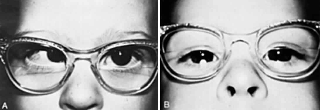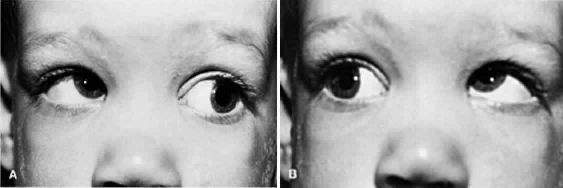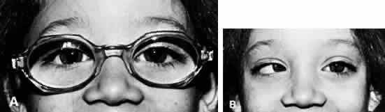an esophoria or an esotropia. The cause of nonaccommodative esodeviations is neurogenic and anatomic. The innervating factor that causes convergence other than accommodative and fusional convergence is known as tonic convergence. Accordingly, the innervational cause of nonaccommodative esotropia is reasoned to be some vague disturbance within the tonic vergences, resulting in either excessive tonic convergence or deficient tonic divergence. It is convenient, although unproved, to use this speculation to explain both congenital esotropia and the esotropia that gradually develops secondary to an anomaly that impairs the sight in one or both eyes of infants and young children. The anatomic factors that probably account for some of the nonaccommodative esodeviation problems are primary anomalies, such as abnormal medial rectus muscles; and secondary anomalies, such as the change that occurs in the medial rectus muscles with excessive innervation, as is encountered in deteriorated accommodative esotropia, abducens palsy, and Duane syndrome. CONGENITAL ESOTROPIA The term congenital esotropia has been criticized as improper by some authors, who argue that these patients cannot be proved to have been born with esotropia.21,22 The basis for this criticism is that the deviation is not present at birth. Based on clinical observations, however, the term congenital esotropia is valid, and it can be easily distinguished from other forms of acquired esotropia.23 Congenital esotropia is usually apparent to the parents shortly after the child's birth. After the first few days of life, when the eyes are open sufficiently for study, the esotropia is detected. Some parents claim the esotropia was not obvious until 1 or 2 months later, but the onset of esodeviation is open to subjective analysis, and it is difficult for the physician to procure good objective analysis. Nixon and co-workers24 observed 1219 alert infants in a newborn nursery to learn whether esotropia is present at birth or develops later in infancy. Orthophoria was found in 593 (48.6%), exotropia in 398 (32.7%), intermittent esodeviations in 17 (1.4%), varying between esodeviations and exodeviations in 14 (1.1%), and variable esodeviations in 9 (0.7%). None of the infants had findings diagnostic of congenital/infantile esotropia. The authors concluded that congenital/infantile esotropia is not present at birth, but develops in the first few weeks to months after birth. Maumenee and associates25 analyzed 173 pedigrees involving 1589 people in an effort to determine the etiology of congenital esotropia. Their results were compatible with a mendelian codominant model, but the estimated transmission probability was not consistent with the mendelian expectation. This suggested that these families had etiologic heterogeneity, the majority being autosomal recessive and some dominant; there may have also been an aggregation of some nongenetic cases. The prevalence of the monofixation syndrome in the general population is approximately 1%. Scott and colleagues26 studied 90 children with congenital esotropia, and 129 of the biological parents. Twelve parents had secondary monofixation syndrome, which reduced the numbers studied to 117 parents and 78 patients. Of the 117 parents, 7 had primary monofixation syndrome, yielding a prevalence of 6% for the parents and 9% (7/78) for the families. Because congenital esotropia is most likely inherited in a multifactorial fashion, the authors believe that the increase in prevalence of primary monofixation syndrome compared with the general population supports the hypothesis that primary monofixation syndrome may be a mild subthreshold effect of the gene or genes responsible for congenital esotropia. Characteristically, the angle of convergence is large and constant, showing little sign of change with age in children without brain damage. A high percentage of brain-damaged infants have congenital esotropia, but their angle of strabismus is usually more variable, frequently diminishing with age; occasionally, the esotropia is spontaneously replaced with exotropia between 6 months and 1 year of age. In a study of patients with infantile esotropia, Holman and Merritt27 found neurologic problems, both general and ocular, in 29 of 47 patients (62%). Problems included prematurity, hydrocephalus, mental retardation, cerebral palsy, meningomyelocele, intraventricular hemorrhage, neonatal and postnatal seizures, and abducens palsy. The authors believed that the high incidence of neurologic problems was, in part, due to the fact that the study was conducted at a university medical center. Nelson and co-workers28 found a prevalence of strabismus of 24% in 29 infants who were prenatally exposed to various psychoactive drugs: 14% had esotropia and 10% had exotropia, which is high compared with the incidence of strabismus in the general population (2.8% to 5.3%). Patients with congenital esotropia must be differentiated from those with very early onset accommodative esotropia who present with a large-angle esodeviation or variable deviation combined with hypermetropia in the range of + 3.75 D to + 7.5.D.29 Diagnosis The majority of patients with congenital esotropia alternate fixation in the primary position and cross-fixate on side gaze, using the right eye in left gaze and the left eye in right gaze, as illustrated in Figure 3. The minority who happen not to alternate their fixation have amblyopia in the nonpreferred eye, which may be profound, as manifest by eccentric fixation. The cross-fixation pattern can be confusing and misleading to the examiner who is not experienced in examining infants with congenital esotropia. The examiner must learn that the absence of the abduction so frequently encountered in these infants is secondary to the cross-fixation habit. The infant who cross-fixates has never abducted an eye, and the examiner finds it impossible to evoke an abduction response on either version or duction studies. The