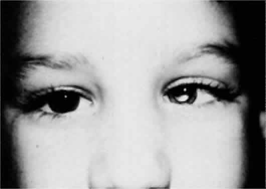 in the cases of exotropia. McNeer and colleagues78 have used botulinum toxin in the nonsurgical management of adults and infants with strabismus. In 57 infants with infantile esotropia, bilateral simultaneous botulinum toxin injections to both medial rectus muscles was performed. In the 27 infants younger than 12 months of age, the average reduction in esotropia was from 43 ± 12 to 1 ± 2 prism diopters. In the 30 infants with a mean age of 24 months, the reduction was from 31 ± 12 to 2 ± 3 D. These authors regard botulinum toxin as a reliable and effective alternative to surgery in infantile esotropia. Botulinum A toxin has been used to treat infantile esotropia, concomitant strabismus, acute cranial nerve palsies, dysthyroid myopathy, acquired nystagmus, essential blepharospasm, hemifacial spasm, myokymia, and vertical strabismus.79,80 Biglan and co-workers79 reported on its long-term effects in a 5-year study involving 308 patients. They found the botulinum A toxin to be useful in the treatment of recent surgical overcorrections, and in some patients with sixth cranial nerve palsy. The chemodenervation was not as successful, however, as traditional strabismus surgery in infantile esotropia and other concomitant deviations, and it was ineffective in the treatment of restrictive strabismus. The side effect of ptosis is an unwanted complication with serious visual consequences in infants. The authors concluded that chemodenervation has the best results in treating acute mild sixth nerve palsies and overcorrections after traditional surgery, but has limited use in treating strabismus. Multiple reinjections and additional strabismus surgery in many of these patients render the chemodenervation technique with botulinum toxin far less effective than initially anticipated. Ing81 compared a group of patients with congenital esotropia treated with botulinum toxin versus a group treated with conventional surgery. Although half of the patients treated with Botox had evidence of binocularity on sensory testing 3 years after alignment, the results were less effective than those achieved by the group who had surgery for establishing binocularity (p < 0.005). ESOTROPIA ASSOCIATED WITH IMPAIRED SIGHT An anomaly that either prevents development of sight in an infant or appears in a young child after the sight has developed is usually associated with an esotropia that is first apparent at 6 months of age or 6 months after the anomaly is acquired. The esotropia gradually increases, but usually does not increase to equal the large angle so frequently found in patients with congenital esotropia. The fixation is irretrievably ruined in the involved eye, and consequently the angle of deviation cannot be measured with prism and alternate cover techniques. The angle must be estimated by the Krimsky prism reflex test. Either a high or a low AC/A ratio may cause the near deviation to be greater or less than the distant deviation. Also, the poorly sighted eye often gradually develops an associated hypertropia in addition to the esotropia, and this is frequently accompanied by an overacting inferior oblique muscle. Ophthalmoscopy provides the answer to the cause of this disorder in many patients. If there is retinoblastoma involvement of the macula, strabismus may be the presenting feature of this serious disease (Fig. 5). Therefore, every strabismic patient should receive an examination of the fundi as soon as possible.