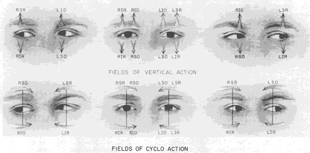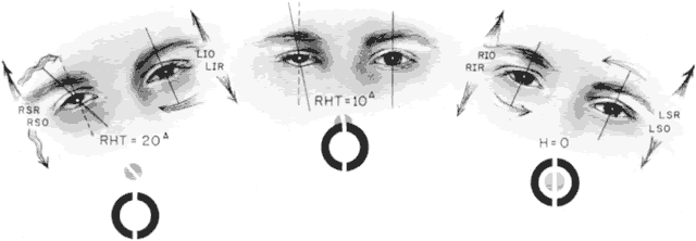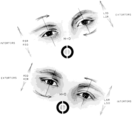 is closed head trauma.1–3,56–61 Of 3000 cases of strabismus reviewed by Khawam and coworkers, closed head trauma ranging from minor to severe caused 68% of the 40 cases of acquired superior oblique palsy.56 Uncertain etiology was noted in 20%, and the remainder of the cases included cerebrovascular accident, diabetes, brain tumor, ethmoiditis, and mastoiditis. The cause of acquired bilateral superior oblique palsy following severe head injury is hemorrhage in the roof of the midbrain at the caudal end of the quadrigeminal plate, the area of decussation of the fourth CN.57 Even mild head trauma causing a mass lesion, a hematoma, may cause traumatic fourth CN palsy.58 In many cases of fourth CN palsy, no definite cause can be established despite extensive clinical and laboratory testing.1–3,62,63 Harley reviewed the etiology of paralytic strabismus in 121 children from birth to age 16 and found 67% of fourth CN paralysis to be of undetermined origin.63 Intracranial tumors and aneurysms also account for the diagnosis in some patients,1–3 up to 24% in the Mayo Clinic series.3 Displacement of the trochlea as a result of surgery or trauma to the orbit is another cause. Damage to the trochlear nerve may occur during intracranial or orbital surgery.34 Transient trochlear nerve paresis was postulated to have occurred from indirect traction on the trochlear nerve during surgery.34,64 Bilateral trochlear nerve palsy has been reported65 in association with cryptococcal meningitis in human immunodeficiency virus infection. Acute fourth CN palsy, which has been reported in association with pseudotumor cerebri in children ages 8, 11, and 15, may be a nonspecific sign of increased intracranial pressure.66 Plagiocephaly, or unilateral coronal suture stenosis, causes a shortening of the roof of the orbit, with posterior displacement of the trochlea. The unreflected portion of the superior oblique tendon is shorter than in the normal orbit, possibly with less efficient contracting power, with resultant overaction of the ipsilateral inferior oblique and ocular torticollis.67 This may not be a true palsy, but the clinical presentation is similar. However, palsy of the superior oblique muscle must be differentiated from palsy of the other cyclovertical muscles, which if paretic, manifest a combined cyclovertical phoria or tropia. Each of the muscles that move the eye in a vertical plane about the X axis of Fick, including the superior oblique muscle, also renders a torsional movement about the Y axis of Fick. The nature of the eye movement produced by contraction of a cyclovertical muscle depends on the horizontal position of the eye. In abduction, the vertical rectus muscles move the eye in the vertical plane and the oblique muscles move the eye in the torsional plane. In adduction, the vertical rectus muscles act torsionally and the oblique muscles act vertically. Both the vertical rectus muscles and the oblique muscles deliver a combined vertical and torsional action in the primary position. The vertical actions and the cycloactions of the eight cyclovertical muscles in the primary position, dextroversion, and levoversion are shown in Figure 5.68 However, the action of the vertical rectus muscles is somewhat more vertical than torsional, whereas the action of the oblique muscles is more torsional than vertical. Therefore, weakness of a single cyclovertical muscle is characterized by vertical and torsional deviation in the primary position. The torsional deviation increases on lateral gaze to one side, while the vertical deviation increases on opposite lateral gaze. For example, given that the left superior oblique muscle is a depressor and intorter, weakness of this muscle results in left hypertropia that increases on right gaze and excyclotropia that increases on left gaze. The diplopia seen by patients with fourth CN palsy is a combined vertical and torsional set of images projected from the object of regard. The superior pole of the low image seen by the palsied eye is tilted inward compared with the superior pole of the high image seen by the normal eye. By sending inhibitory innervation to the palsied muscle, the diplopia disappears. Inasmuch as the superior oblique muscle depresses and intorts, its tone is diminished by upgaze and by tilting the head to the shoulder opposite the palsied muscle that extorts this eye. The typical ocular torticollis noted in patients with fourth CN palsy is chin depression and head tilt, as depicted in Figure 6.