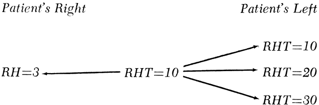 With vertical concomitance established, another sign of contracture of the direct antagonist inferior oblique muscle is the overelevation of the adducted palsied eye (secondary overaction of inferior oblique muscle). By having the patient move the eyes into the cardinal fields, the clinician can easily misdiagnose left superior rectus muscle palsy instead of correctly diagnosing right superior oblique muscle palsy and vice versa. The misdiagnosis occurs so frequently that it has received the auspicious name of inhibitional palsy of the contralateral antagonist.71 During cardinal field testing, as the patient fixates with the eye that is innervated by the palsied fourth CN, underelevation of the abducted opposite eye is conspicuous to the examiner, who may be inclined to attribute this condition to palsy of the superior rectus muscle of the sound eye. This error in diagnosis is less apt to happen while the patient fixates with the sound eye because it makes the full movement in elevation and abduction, but fixating with the palsied eye makes the less than normal elevation in abduction of the sound eye obvious. This apparent deficiency in the function of the sound eye in this particular cardinal field is due to the less than usual innervation being dispatched to the inferior oblique muscle of the fixating palsied eye to drive against the atonic palsied superior oblique muscle to continue pursuit of an elevating adducting target. By the law of Hering, equal innervation is dispatched to yoke muscles, resulting in deficient innervation to drive the sound eye upward against the normal tone in its inferior rectus muscle. The terms yoke and contralateral agonist are synonymous names for the same muscle. Both an agonist (palsied muscle) and a contralateral agonist (yoke to the palsied muscle) have antagonists (direct and contralateral). The superior rectus muscle of the sound eye is the contralateral antagonist to the palsied muscle. Because the mistaken diagnosis of palsy of the superior rectus muscle of the opposite eye in the patient with fourth CN palsy is due to inhibition of the normal innervation sent to carry out its normal function, the misdiagnosis is attributable to an inhibitional palsy of the contralateral antagonist, not to a bona fide palsy of an agonist. To prevent erroneous diagnosis of fourth CN palsy, the Bielschowsky head-tilt test should always be done and the measurements recorded, because contracture of the direct antagonist of the ipsilateral palsied muscle does not influence findings. To evaluate any isolated cyclovertical muscle palsy logically, including fourth CN palsy, the accumulation of three separate pieces of information followed by three separate reasoning steps invariably provides an accurate diagnosis. The clinician should develop a policy of applying three separate steps known as the three-step test, which follows:68 III. B. 1.