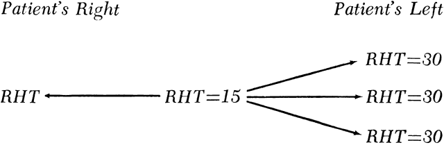 Spontaneous head tilt in superior oblique muscle palsy may be absent, or the tilt may be directed toward the same side as the eye with the superior oblique muscle palsy. The binocular vision may be inadequate to overcome a residual vertical deviation, or the presence of poor vision or amblyopia may preclude diplopia in the primary position or the achievement of binocular vision in some other gaze direction.69 Lewis and coworkers70 studied ocular alignment and saccades in seven patients with trochlear nerve pareses, before and after strabismus surgery. A position-dependent vertical ocular misalignment was present before surgery, and the downward saccades were hypometric in the paretic eye. The magnitude and the position-dependence of the static misalignment were reduced by strabismus surgery. In those patients with congenital pareses and in the patient with an acquired paresis, saccade conjugacy improved, but in those patients with traumatic pareses, less improvement occurred. The authors note that postoperative change in saccade conjugacy in relation to the change in static alignment correlated with preoperative vertical vergence, suggesting that the changes in saccade yoking depended on interaction between vertical vergence and saccades. Soon after onset of fourth CN palsy, the cardinal field test reveals the disorder, because hypertropia is greatest in the vertical field of action of the superior oblique muscle (Fig. 7). However, as the palsy continues for many months, contracture of the ipsilateral inferior oblique muscle begins to manifest itself by eliminating the early cardinal field finding. On the side in which the vertical deviation of the eyes is greatest, hypertropia measures the same in upgaze and downgaze (i.e., the hypertropia becomes concomitant) (Fig. 8). Hence, vertical concomitance requires that some test other than cardinal field measurements be done to diagnose the palsied cyclovertical muscle correctly.