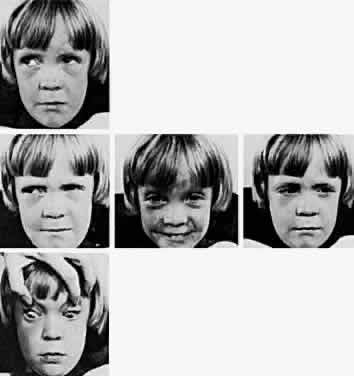 have been reported.160,161 Deletion of chromosome 13 in two reports162,163 suggests that the Moebius gene is located in the region of chromosome 13. Esotropia and inability to abduct the eyes are the usual reasons for the patient to be referred to an ophthalmologist. Horizontal versions are lacking, but vertical version and convergence are intact (Fig. 3). Because of the inability to move the eyes horizontally in response to horizontal version stimulation, the patient may maintain fixation of the laterally moving target by voluntarily converging. Pupillary constriction and increasing accommodation occur as the voluntary convergence increaseswhile the patient visually tracks the target farther and farther into either right or left gaze. Normal reading despite limited eye movements has been reported in two patients with Moebius syndrome, suggesting that normal eye movements are not required for the development of reading skills, and that efforts to normalize eye movements in poor readers by vision therapy may be misdirected.164