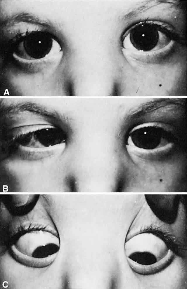 junction or within the muscle fiber. PROGRESSIVE EXTERNAL OPHTHALMOPLEGIA Progressive myopathy of the extraocular muscles is invariably bilateral, but it may affect one eye before the other. In the end stage, the condition is remarkably symmetric. It may be either sporadic or hereditary; if it is hereditary, it is usually autosomal dominant.219 Acquired ptosis is usually the first sign of the disorder, and the other extraocular muscles may not reveal their condition until some years later. It often starts toward the latter part of the first decade of life during adolescence, but it may be delayed until after the first 20 or 30 years of life. The important feature of this disease is progression. The medial rectus muscle is the most frequently involved of the extraocular muscles, and if strabismus appears, exotropia is common. Elevation weakness usually appears before depression weakness, and thiscauses the patient to adopt a compensatory chin-upposture; however, as the condition progresses, the motility of the eyes eventually decreases to zero. The intraocular muscles of the eye are not involved. Progressive external ophthalmoplegia is often associated with involvement of other muscle groups, particularly the sternomastoid muscles, the deltoid, and the trapezius. The related condition involving the various muscle groups of the body is hereditary progressive muscular dystrophy, and it may be difficult to separate these two disorders. Except for one report220 of external ophthalmoplegia in association with genetic, clinical, histologic, and electromyographic evidence of myotonic dystrophy, it is not related to the hereditary chronic progressive myotonic dystrophy that most frequently affects the muscles of the upper portion of the body before progressing to the other skeletal muscles. The latter condition is associated with cataracts that are usually acquired in the latter part of the second decade of life, and it is also frequently associated with retinal dystrophy. Carta and coworkers221 performed ultrastructural investigation and molecular analysis of mitochondrial DNA on extraocular muscle samples from a sporadic case of chronic progressive external ophthalmoplegia. Focal areas of mitochondrial disruption and abnormality were found by electron microscopy in only some of the muscle fibers, producing selective vacuolization. This case resembled the findings in Leber hereditary optic neuropathy, another mitochondrial disease, with selective damage only in the papillomacular bundle of the retina, but sparing peripheral axons, which suggests some common anatomic and physiologic factors in both diseases. The electromyogram is diagnostic for this condition and shows normal recruitment but low amplitude. Treatment entails supporting the lids either by crutch spectacles or surgery for ptosis. Because the cause is unknown, there is no specific medication for this disorder. External ophthalmoplegia in association with pigmentary retinopathy and cardiomyopathy has been described extensively by Kearns and Sayre222,223 |