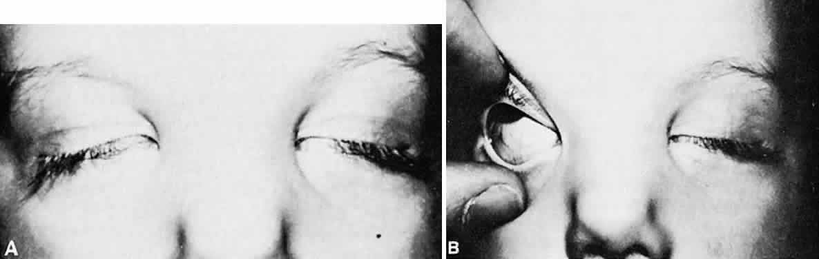 The surgical approach to center these eyes and to improve the compensatory head posture must be unorthodox. Recessions of the inferior rectus muscles of 8 mm or more are required to allow the eyes to come to a relatively level position. Bilateral frontalis suspension surgery for the ptosis is the safest approach because of the absence of a Bell phenomenon. The surgeon should purposely undercorrect the ptosis to prevent cornea damage from exposure in the absence of a Bell phenomenon. Surgery for the ptosis can be combined with the recession of the inferior rectus muscles. Scott196 described transposition of the superior oblique tendon to a position between the superior and medial rectus muscle insertions, in association with other extraocular muscle surgery for correction of hypotropia and exotropia in congenital fibrosis CONGENITAL FIBROSIS OF THE INFERIOR RECTUS MUSCLE Congenital fibrosis of the inferior rectus muscle183 is probably a variant of the generalized fibrosis syndrome, but only the inferior rectus muscle becomes involved, because of its peculiar predilection for becoming fibrotic. The condition may be unilateral or bilateral, but if it is bilateral, it is usually asymmetric, with greater involvement of one eye. Vertical strabismus is inevitable with this disorder, and if the patient maintains binocular vision, a compensatory chin-up posture is adopted. Congenital fibrosis of the inferior rectus muscle must be differentiated from double elevator palsy in which the traction test result is normal; however, with fibrosis of the inferior rectus muscle, it is impossible to elevate the eye passively. Surgical correction of this disorder requires maximal recession of the inferior rectus muscle. As soon as the inferior rectus muscle is disinserted, the traction test is converted to normal. |