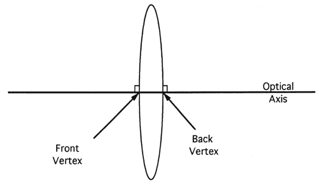 A vertex is any intersection of the axis with a lens surface (Fig. 3). At the vertex, the axis is normal (i.e., perpendicular) to the lens surface.