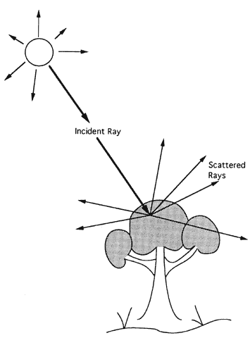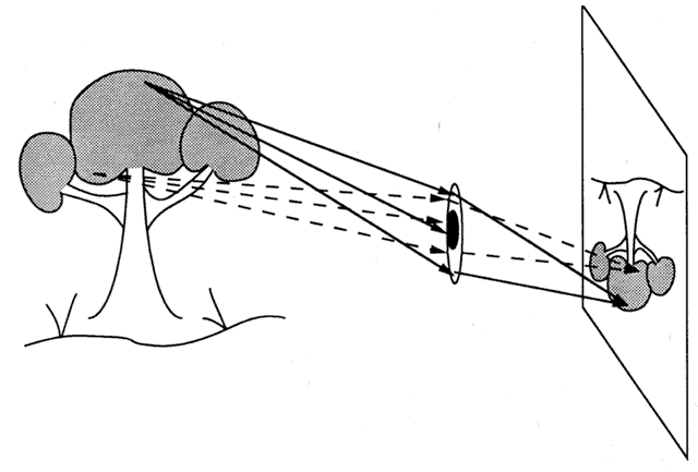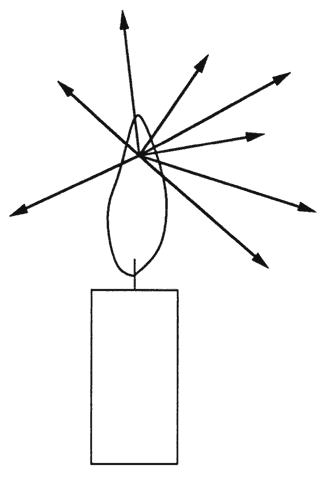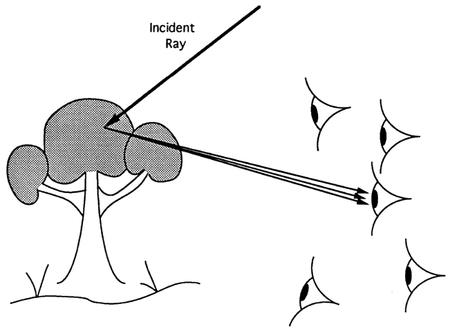 The one-to-one correspondence between object and image points is the essential feature of the stigmatic image. The word stigmatic derives from the Greek “stigma,” meaning stylus or point, and emphasizes the point-to-point nature of the stigmatic image. Imaging is a two-step process. In the first step, an object distributes light in all directions. This is an important step. If an object radiates light in only one direction, then it will be visible from only one vantage point (Fig. 10). Scattering light makes objects visible from many directions simultaneously (Fig. 11). Although beneficial, scattering necessitates a second step, the redirection of light by an optical system to produce an image.