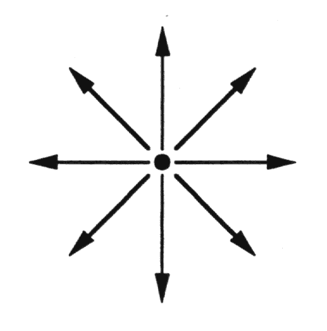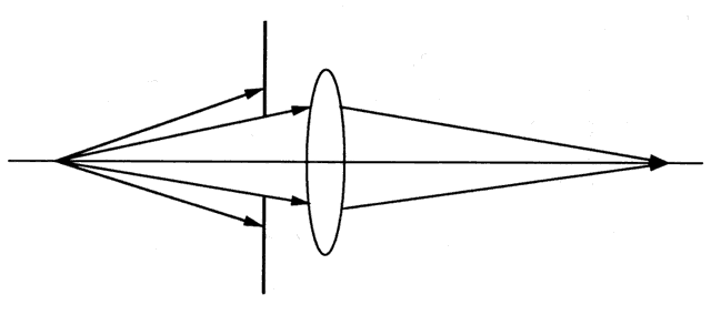 A point source (Fig. 7) occupies no volume (i.e., a point in the mathematical sense) and radiates light in all directions. Point sources do not exist, but conceptually, objects are simply a collection of point sources. Every object point is a point source radiating in all directions. Point sources simplify the analysis of optical systems by making it possible to deal with one object point at a time. THE STIGMATIC IMAGE Each point on a screen (e.g., piece of paper) placed near an object receives light from many object points (Fig. 8), and no image appears. An appropriate lens placed between screen and object redirects light so that each point on the screen receives light from a single object point (Fig. 9), thereby producing an image. Without the lens, light from a single object point distributes over the entire screen, mixing with light from every other object point. With the lens, however, light from a single object point falls on a single screen point and does not mix with light from any other object point.