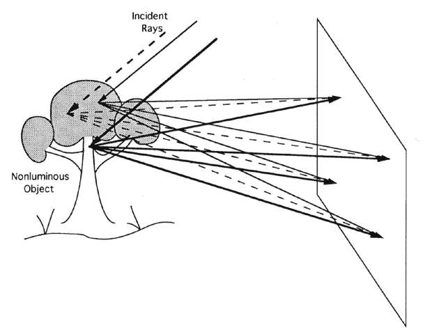 OBJECTS An object may be luminous or nonluminous. A luminous object or source produces light and is visible in otherwise total darkness. Every point on a luminous object radiates light in all directions (Fig. 4). Nonluminous objects do not produce light and are visible only when illuminated by a source. When light strikes a point on a nonluminous object, it is diffusely reflected or scattered in all directions (Fig. 5).