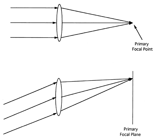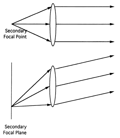 An object point at the primary focal point produces image rays that are parallel to each other and the axis (Fig. 22). Thus, the primary focal point's image is on-axis at infinity. The primary focal plane is normal to the axis through the primary focal point. Object points on the primary focal plane give image rays that are parallel to each other but not necessarily parallel to the axis (see Fig. 22). |