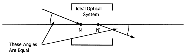 Many textbooks use the terms front and back instead of primary and secondary. However, in some lenses the “front” principal plane can be behind the “back” principal plane. To avoid confusion, this text uses the directionally neutral terms primary and secondary. The nodal points are another pair of useful landmarks located on the axis. An object ray passing through the primary nodal point is conjugate to an image ray passing through the secondary nodal point, and both rays make the same angle with the optical axis (Fig. 24). There are no nodal planes associated with the nodal points.