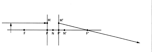 STEP 2. Pick some point on the object but not on the optical axis. Rays emanate from this point in all directions. In particular, one of these rays will be parallel to the optical axis. Draw the ray parallel to the axis from the object point to the primary principal plane (Fig. 27). Conceptually, this ray extends backward to infinity; in principle, this ray goes through the axial object point at infinity. STEP 3. The object ray drawn in step 2 goes through two important object points: 1) the axial object point at infinity and 2) a point on the primary principal plane (point M). The image ray must go through the images of these two object points. The image of M is M'. M' is a point on the secondary principal plane at the same height above the axis as point M because the principal planes are conjugate with a magnification of 1. Thus, the image ray must go through M' and the secondary focal point. The image ray is drawn through these two points (Fig. 28).