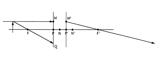 STEP 4. Many other rays emanate from the object point, including one that goes through the primary image point F. Draw this ray and extend it to the principal plane (Fig. 29). STEP 5. The ray drawn in step 5 must be conjugate to an image ray parallel to the axis (because the object ray goes through the primary focal point). The image ray must also pass through Q', the image of Q. Draw the second image ray through Q' and parallel to the axis (Fig. 30).