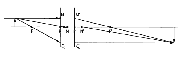 STEP 1. Ignore the presence of the lenses because the locations of the cardinal points completely determine the properties of an ideal system. If necessary, redraw the object and optical system to scale using just the optical axis and cardinal points. Draw the principal planes through the principal points and normal to the axis (Fig. 26).