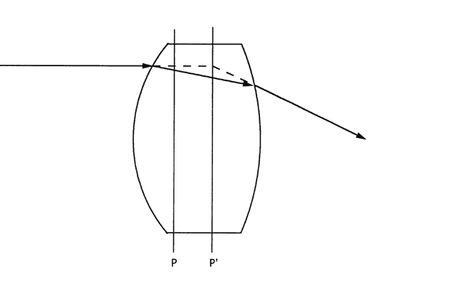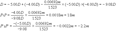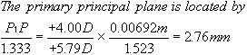 Where D1 = power of the first surface, D2 = power of the second surface, and n2 = refractive index of the glass. The distance between the primary principal plane of the front surface and the primary principal plane of the combined system (designated as P1P) is given by: