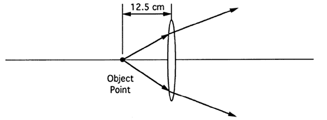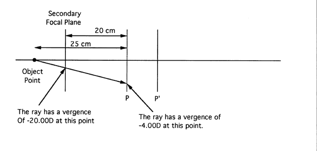 vergence, and convergent light has a positive vergence. Vergence is a property of a ray, and every point on a ray has a different vergence. To give a concrete example, consider an object point 25 cm away from the primary principal plane of an ideal lens and 5 cm in front of the primary focal plane (Fig. 35). When rays from the object point cross the primary focal plane, they have a vergence of -20.00 D. The vergence is negative because the light is divergent. The number 20.00 is the reciprocal of the distance in meters between the object point and focal plane (5 cm = 0.05 m, 1/0.05 = 20). The uppercase “D” is the standard abbreviation for diopter. The diopter is the standard unit of vergence used clinically. When the light reaches the primary principal plane, the vergence is -4.00 D. Again, the vergence is negative because the light is divergent. The number 4 is the reciprocal of the distance between the object point and principal plane (0.25 m).