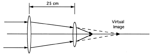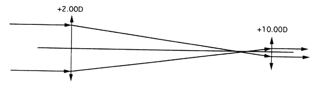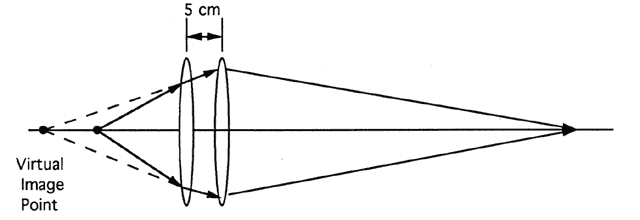 No light goes through this virtual image point. Light does not travel over the part of the image rays extended backward. The virtual image point is a mathematical construct; if a piece of paper is placed 20 cm in front of the first lens, no image will be observed. This mathematical construct is called virtual because it does not represent a real image. It is called an image because it is associated with the image rays emerging from the first lens. The virtual image is 25 cm in front of the second lens. Thus, light incident on the second lens has a vergence of -4.00 D. Light emerging from the second lens has a vergence of + 2.00 D, giving an image 50 cm behind the second lens. Next, consider an object far away from a + 2.00 D lens. The lens forms an image 50 cm behind itself. Where is the image if a + 6.00 D lens is placed 25 cm behind the first lens (Fig. 38) Again, the vergence of the light incident on the second lens is the key issue. Light incident on a lens from a real object is always divergent. However, in this case, the light incident on the second lens is convergent. The convergent light is associated with an object point 50 cm behind the lens, but real objects are always in front of a lens. This example represents a virtual object. The virtual object is 25 cm behind the second lens, giving the incident light a vergence of + 4.00 D. Rays emerging from the second lens have a vergence of + 10.00 D, giving an image 10 cm behind the second lens.