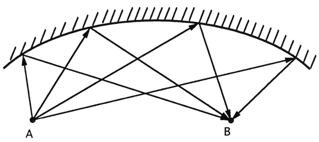 It is possible to show mathematically that for the shortest path the incident and reflected rays are always symmetric. Thus, the law of (specular) reflection follows from Fermat's principle. To state the law of reflection formally, it is necessary to define some additional terms. The surface normal is an imaginary line perpendicular to a surface at the point where a ray strikes the surface. There is a different surface normal at every point on a surface. The angle of incidence is the angle between the surface normal and the incident ray. The angle of reflection is the angle between the surface normal and the reflected ray. The law of reflection states that the incident ray, reflected ray, and surface normal lie in the same plane, and the angles of incidence and reflection are equal. A flat mirror reflects a single ray from A to B. To produce a stigmatic image of A at B, all rays striking the mirror must pass through B. By Fermat's principle, this can happen only if every path from A to B has the same length. Bending the mirror equalizes the path lengths. In this case, an elliptical mirror gives a stigmatic focus (Fig. 41). The mirror's shape must be perfect, and it is not easy to fabricate such a mirror. If the shape is slightly off, some reflected rays will miss B but pass nearby.