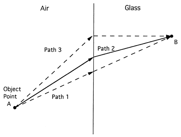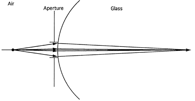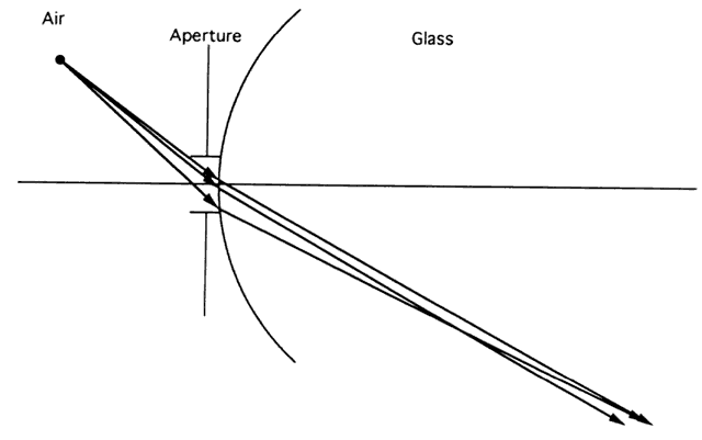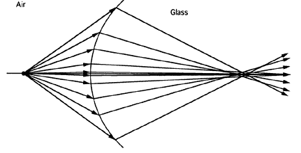 unnecessary. Figure 45 shows the path of several rays from one object point refracted by a spherical surface. The exact ray paths can be calculated by use of Snell's law. The details are in the Appendix. The rays do not converge to a single point. A spherical refracting surface does not produce a stigmatic image.