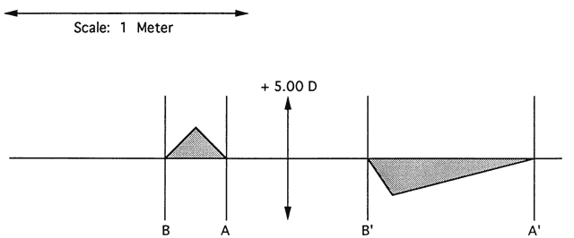 A vector is an abstract mathematical representation for anything that has both magnitude and direction. Two vector quantities are routinely used in clinical practice, namely, cylinders and prisms. To prescribe a cylinder, both a power (magnitude) and an axis (direction) must be specified. Similarly, to prescribe a prism, both a power (magnitude) and base position (direction) must be specified. In contrast, to prescribe a sphere, only a power (magnitude) must be specified; there is no direction. Vector arithmetic is a set of rules developed by mathematicians to perform operations such as addition and subtraction of vectors. Vector arithmetic is quite different from ordinary arithmetic, and one can be led far astray if intuitive notions based on ordinary arithmetic are applied to vectors. To give a concrete example, suppose you walk 4 miles due east, turn, and walk 3 miles due north. Ordinary arithmetic tells us that you have walked a total of 7 miles, but vector arithmetic tells us that you are only 5 miles (as the crow flies) from the original starting point. Fortunately, it is not necessary to understand the rules of vector arithmetic to use vectors effectively. Moreover, the rules of vector arithmetic are well summarized in many textbooks and thus will not be repeated here. The interested reader can find an excellent treatment in a paper by Jaffe and Clayman.1 Clinicians need not master the mathematical details; they should appreciate that prisms and cylinders add (and subtract) vectorially. For example, suppose one wants to use prisms in a patient with a combined deviation of 3Δ right hypertropia and 4Δ esotropia. It would be correct to prescribe 3Δ base down OD and 4Δ base out OS. However, it is expensive to grind prism into a lens, and because the prism power is low, it might be better to put the correction into a single lens. Vectors can be used to determine the appropriate prism power and base position (5Δ base at 217). The vector “calculation” can be done graphically by use of a ruler, protractor, and graph paper. Base-up prism and base-down prism can be represented by vectors pointing straight up and straight down, respectively. For the right eye, base in and out are represented by vectors pointing left and right, respectively. For the left eye, base in and out are represented by vectors pointing right and left, respectively. Specify a point on the graph paper as the starting point or origin, and choose an appropriate scale--in this case, perhaps one prism diopter to the inch. Starting at the origin, draw one of the vectors, say the 4Δ base out vector (Fig. 104). Next, starting at the end of the first vector, draw the second vector representing 3Δbase down (see Fig. 104). Finally, draw a vector from the origin to the end of the second vector. The length of this line is the final prism power, and the angle this line makes with the horizontal gives the orientation of the base. If done with care, this is a very accurate way of adding vectors.