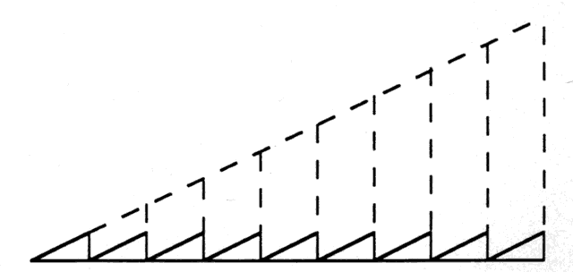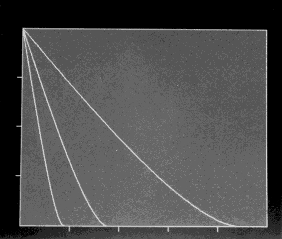 Images can be analyzed in the same way. The trick is to find an optical equivalent of a pure tone. The optical analog of a pure tone is a sine wave grating (SWG). Figure 62 gives several examples. The frequency of the grating is determined by the horizontal peak-to-peak distance. The grating contrast is indicated by the difference in brightness between the brightest and darkest points and is analogous to the volume of a tone. One difference between sound and optics is that SWGs have an orientation--vertical, horizontal, or any oblique axis. Just as sound is a mixture of pure frequencies, images are a mixture of SWGs. The image of a single SWG has the same frequency and orientation as the original SWG, but the contrast is always decreased. The ratio of the image SWG's contrast to the object SWG's contrast is the transfer factor. The transfer factor is always between zero and 1, and different frequencies have different transfer factors. The graph of transfer factor versus frequency is the MTF and is exactly analogous to the frequency response of an audio system. The MTF of an ideal optical system (no loss of detail) would be a horizontal line (Fig. 63). This is impossible to achieve because of diffraction. Figure 64 shows the diffraction-limited MTF for three different apertures. At some point, the MTF becomes zero; this is the cutoff frequency. An SWG with a frequency exceeding the cutoff images as uniform gray. No variation in contrast is seen. In other words, SWGs with frequencies above the cutoff do not appear in the image. SWGs with frequencies below the cutoff appear in the image but at reduced contrast compared with the original. The cutoff frequency roughly corresponds to the resolution.