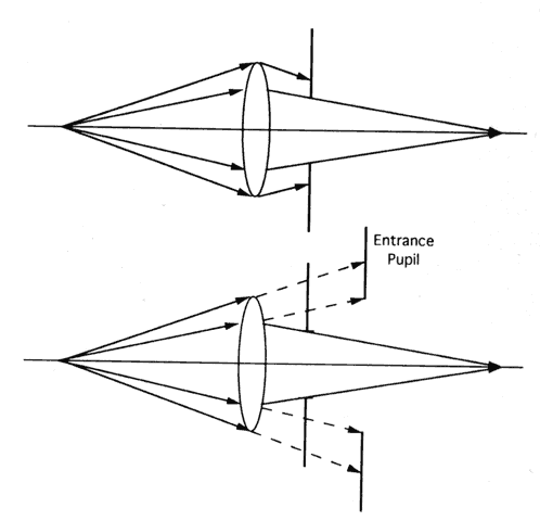 in optical systems. An optical system collects only a small fraction of the light from an object. Some apertures limit the amount of light gathered. This type of aperture may be the edge of a lens, but usually a special aperture of adjustable size is placed in the optical system to control image brightness. The aperture limiting the bundle of rays from an on-axis object point is the aperture stop (Fig. 66).