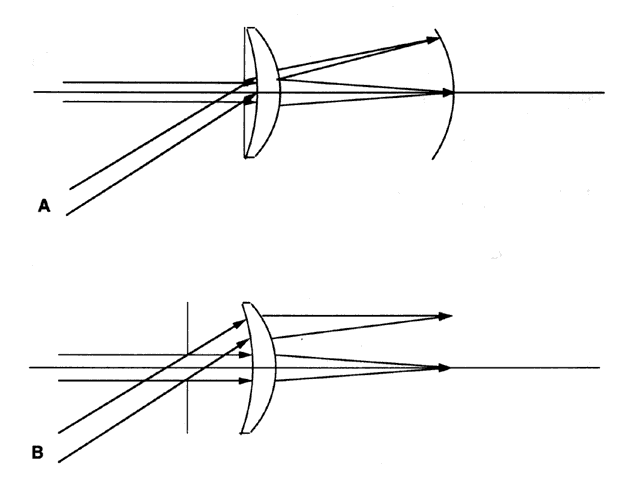 Paraxial means “near the axis.” To be paraxial, the ray must stay close to the axis over its entire path from object to image. Figure 47 shows a far off-axis object point. Rays from this object point are near the axis when they cross the lens, but they are not paraxial rays. The image of this off-axis object point is not stigmatic. Thus, the paraxial approximation is valid only for object (and image) points near the axis. How far from the axis can a ray be and still qualify as paraxial? There is no definitive answer to this question. For very precise work, the rays may need to be quite close to the axis. For less demanding applications, rays can be farther from the axis. Spherical refracting surfaces do not produce stigmatic images. However, under paraxial conditions, the spherical refracting surface becomes an ideal imaging system. It is legitimate to treat an optical system as ideal whenever the paraxial approximation is valid. The paraxial approximation is valid in most clinical situations. |