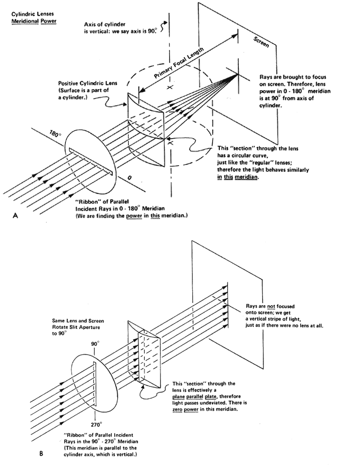 to vertical and observe that the image is now a vertical line. Consider a point source imaged by a positive cylindrical lens, axis vertical (Fig. 71). Rays from the point source fanning out horizontally are converged, but rays fanning out vertically are undeviated. The classic teaching is that a cylinder's power is perpendicular to its axis. However, it is more correct to say that a cylinder's maximum power is perpendicular to its axis. Figure 72 shows the power of a + 2.00 D cylinder horizontal axis in each meridian.