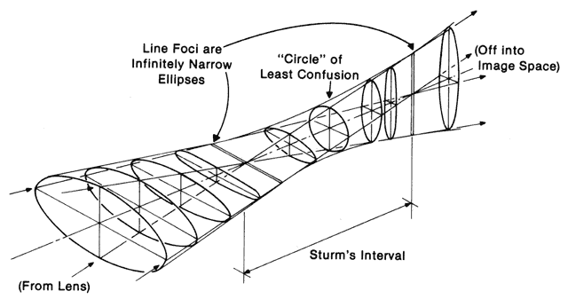 It is also classic teaching to say that a cylinder gives a line image. However, an image is a point-to-point correspondence. A cylindrical lens spreads light from a point source into a line; this is a severe form of aberration called astigmatism. Literally, astigmatism means not stigmatic. However, many aberrations are not stigmatic, so the term is not very descriptive. Place a + 9.00 D cylinder axis horizontal directly behind a + 4.00 D axis vertical cylinder and image a candle. Not surprisingly, the “image” is a horizontal line close to the lenses and a vertical line farther from the lenses. Both lines cannot be seen on the paper simultaneously; it is necessary to move the paper back and forth between the two lines. The location of each line can be calculated by use of vergence. If the candle is 1 m (-1.00 D) from the lenses, the + 9.00 D cylinder gives a horizontal image + 8.00 D (12.5 cm) behind the lenses. The + 4.00 D cylinder gives a vertical line + 3.00 D (33 cm) behind the lenses. Move the screen and explore the region between the two line images. Starting at the vertical line and moving toward the lenses, the image becomes an ellipse with the long axis vertical. As the screen moves forward, the ellipse gets rounder, becoming a circle about midway between the lines. Moving farther forward, the image becomes an ellipse with the long axis horizontal. Moving the screen farther forward, the ellipse elongates until the image becomes a horizontal line. The region between the lines is the conoid of Sturm, and the circle is the circle of least confusion (Fig. 73).