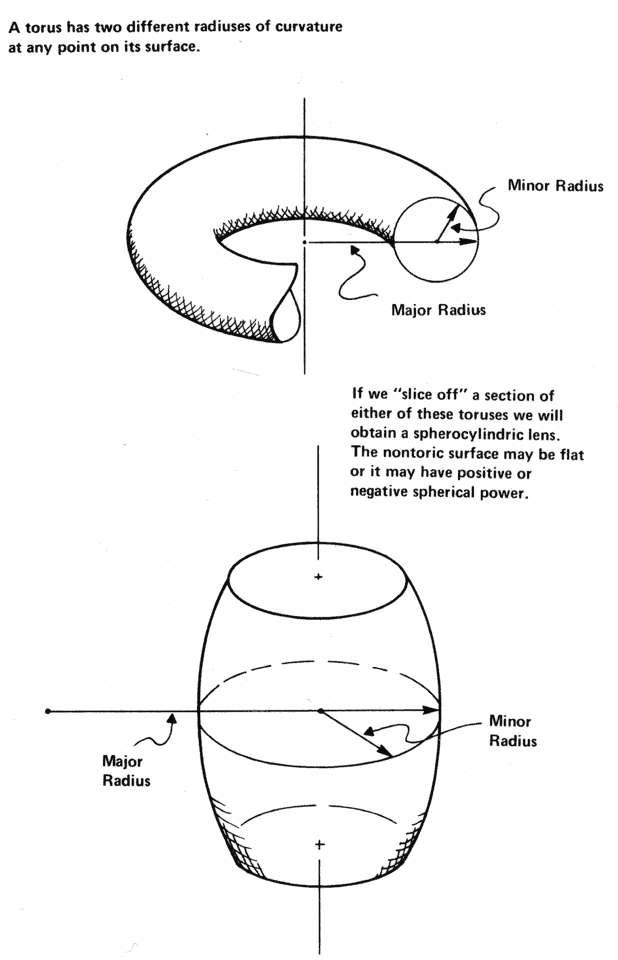 Replace the + 9.00 D cylinder with a + 6.00 D cylinder, keeping the axis vertical. The line images become shorter and closer together. Replace the + 6.00 D cylinder with a + 4.00 D cylinder, axis vertical. The candle's image is now clear. The two cylinders act as a + 4.00 D sphere. This is a key point. Two cylinders of the same power with axes perpendicular are equivalent to a sphere of the same power as the cylinders. Consider the + 4.00 D and + 9.00 D cylinders with axes perpendicular. Four of the nine diopters of the vertical cylinder combine with the horizontal cylinder to give a + 4.00 D sphere. The remaining + 5.00 D give a vertical cylinder. Combine a + 5.00 D cylinder with a + 4.00 D sphere and image a candle. The result is the same as the combination of the + 4.00 D and + 9.00 D cylinders. The combination of a sphere and cylinder is a spherocylinder. Cylindrical power can be combined with spherical power in a single lens by grinding the lens as a toric surface (Fig. 74). The spherical equivalent power of a spherocylinder is the average of the maximum and minimum powers, which equals the sphere power plus half the cylinder power.