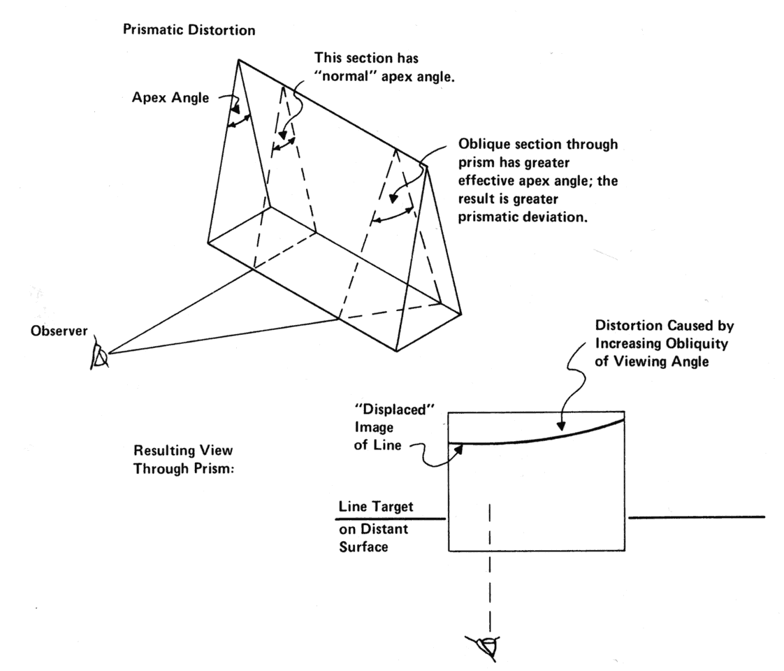 One problem with prescribing large prism powers is prismatic deviation. Gazing through a strong prism at an oblique angle produces a different deviation than when gazing at normal incidence (Fig. 79). This can make straight lines appear curved, and some patients find this annoying.
