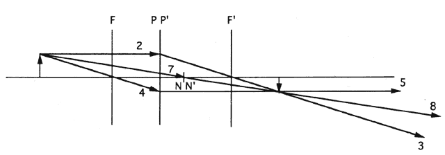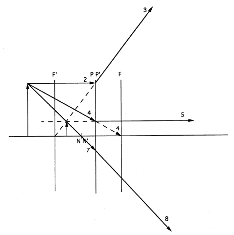 STEP 8. The image ray conjugate to the object ray drawn in step 7 goes through the secondary nodal point and is parallel to the object ray (Fig. 33). This ray should intersect the other two at the image point.
